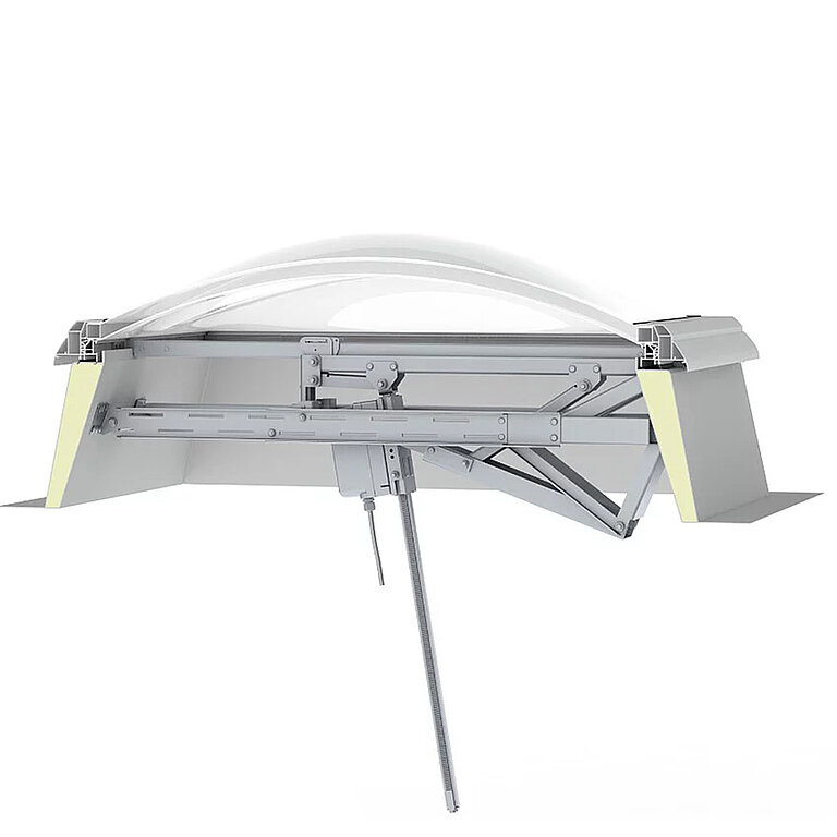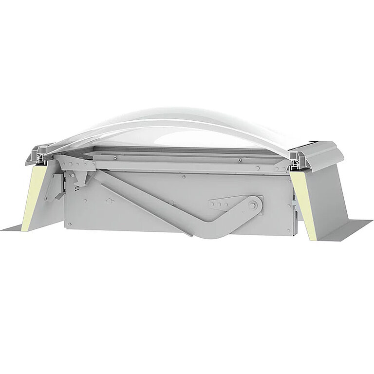 Die Lichtkuppel F100 W mit Rauchlift lässt sich nahtlos in bestehende Brandschutzkonzepte integrieren. Sie kombiniert die Funktionen und Vorteile eines Oberlichts mit intelligenter Steuerung und wird so zu einem zuverlässigen Rauch- und Wärmeabzugsgerät.