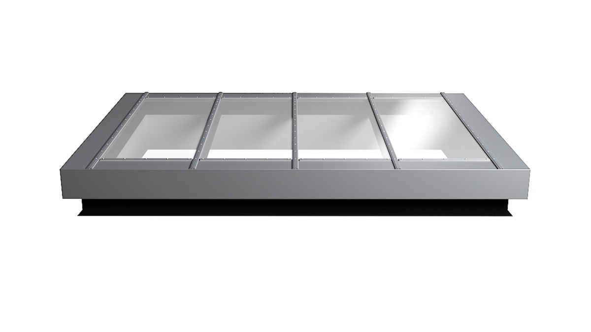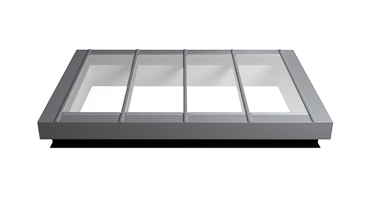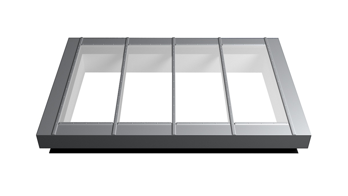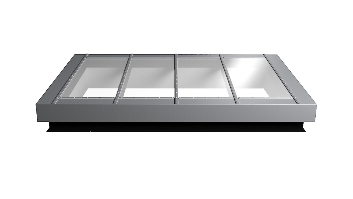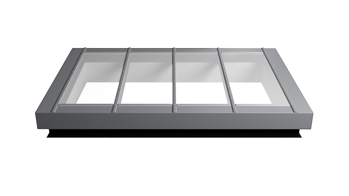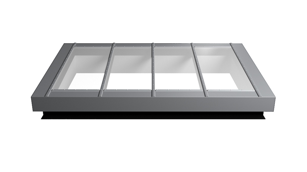 Nahaufnahme Glasdach Fire Resistance mit drei Feldern auf Flachdach mit Kiesumrandung.