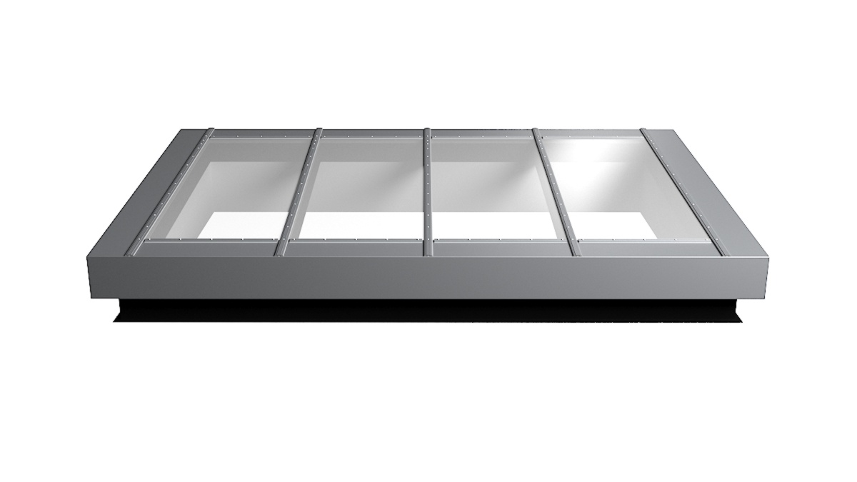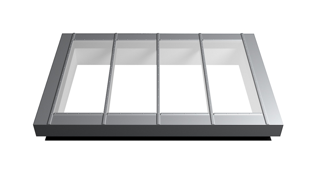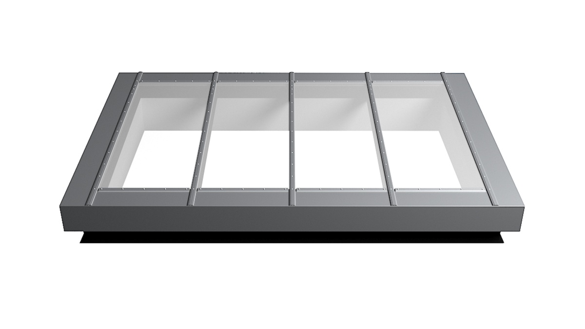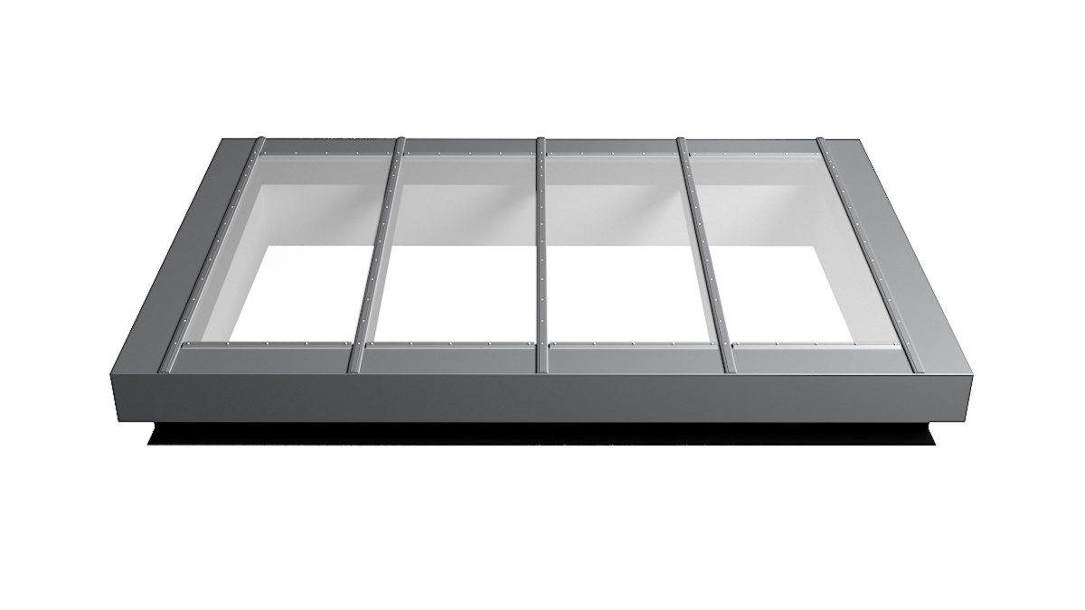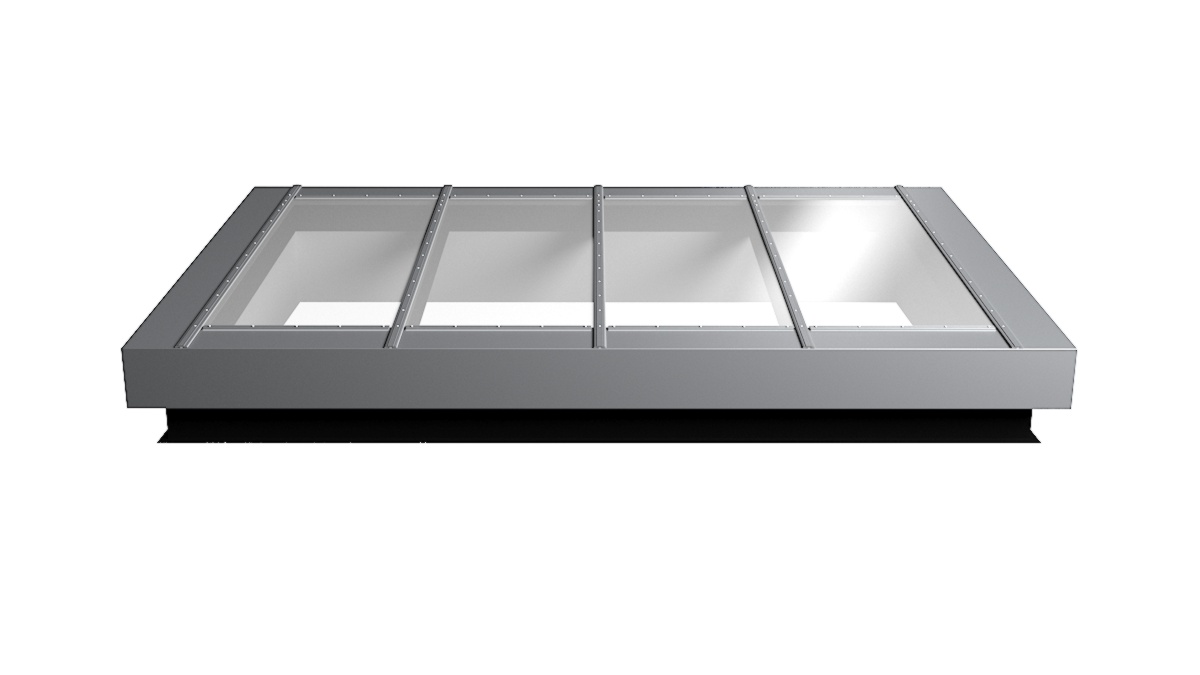 Nahaufnahme Glasdach Fire Resistance mit drei Feldern auf Flachdach mit Kiesumrandung.