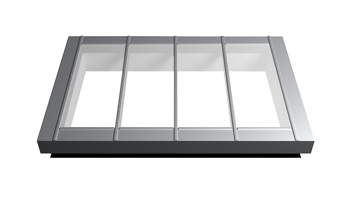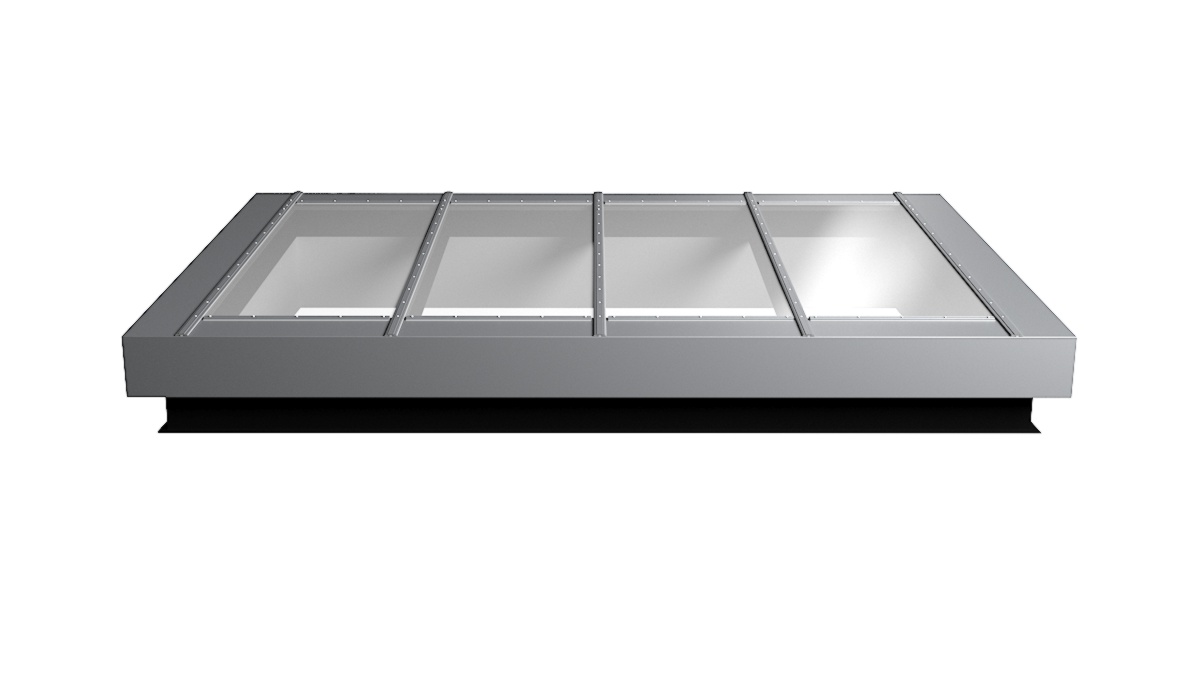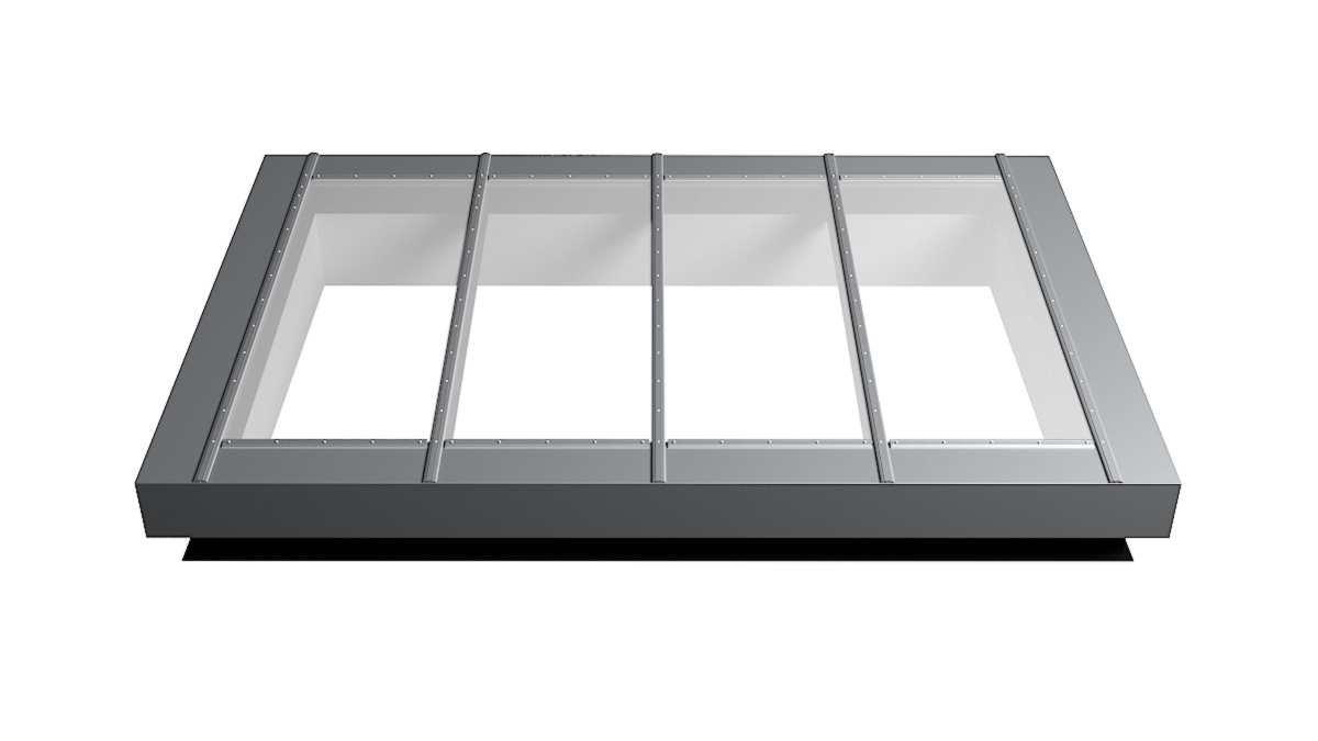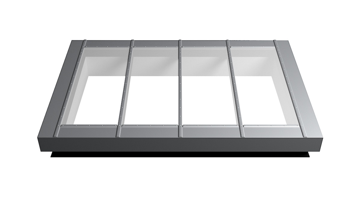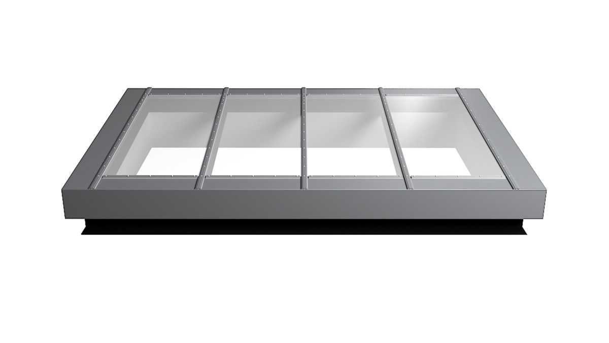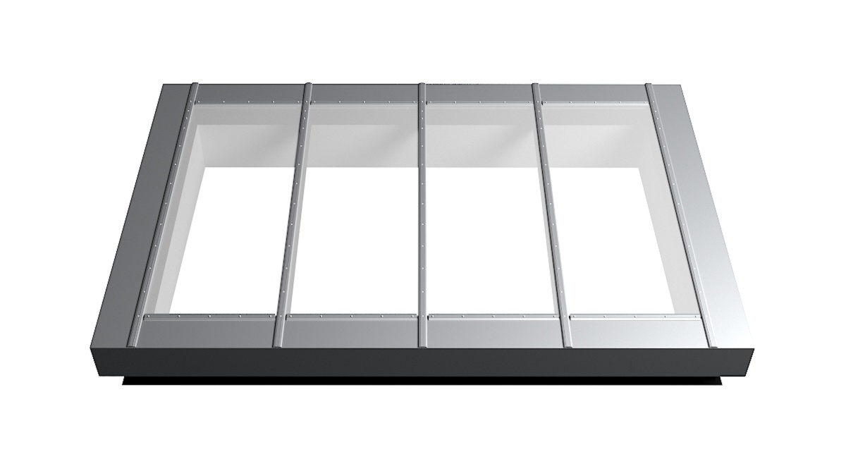 Nahaufnahme Glasdach Fire Resistance mit drei Feldern auf Flachdach mit Kiesumrandung.