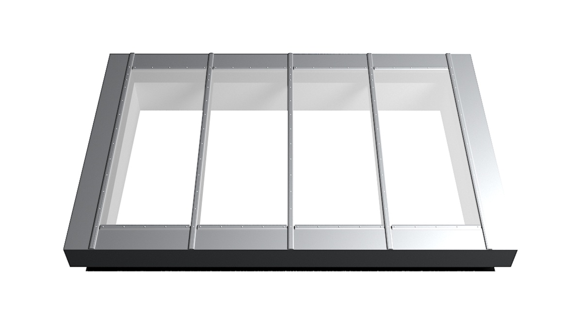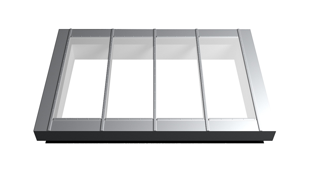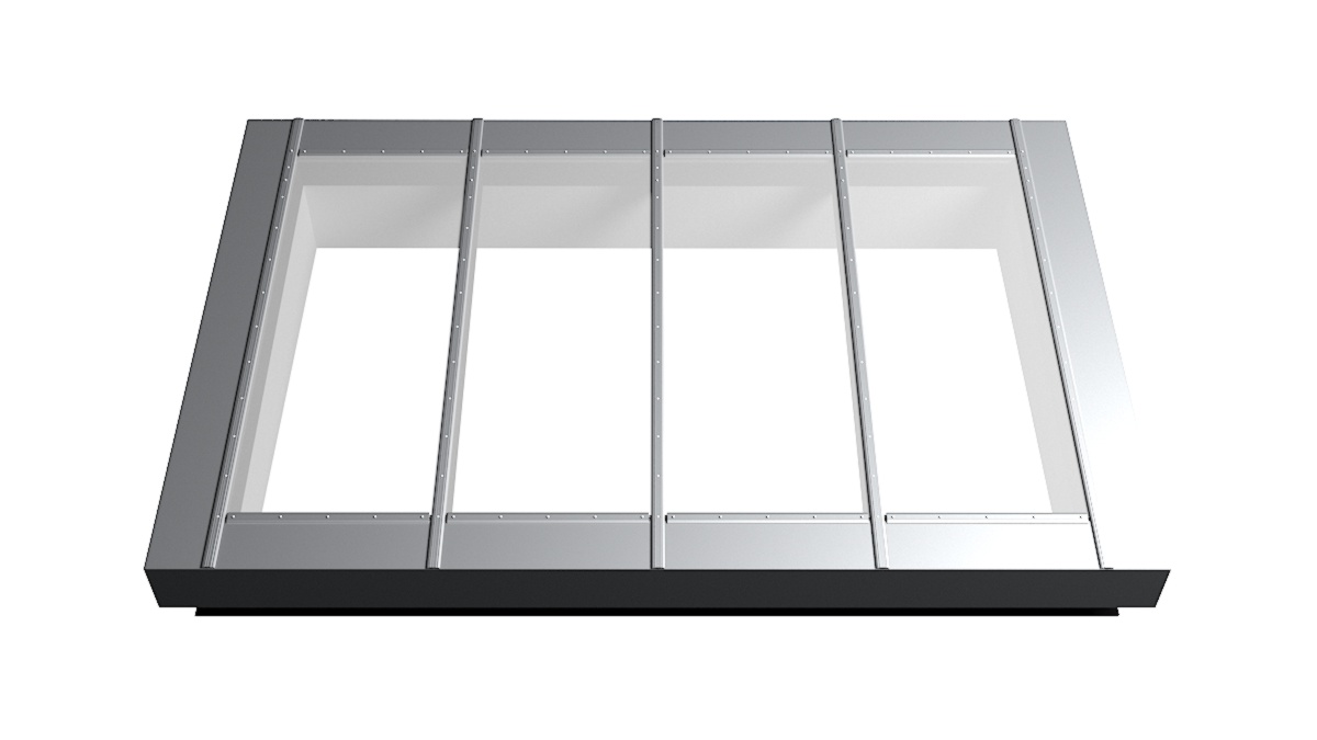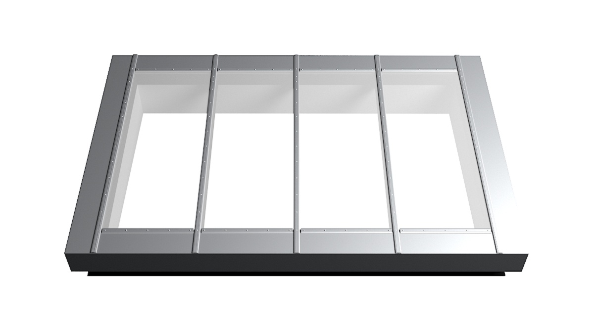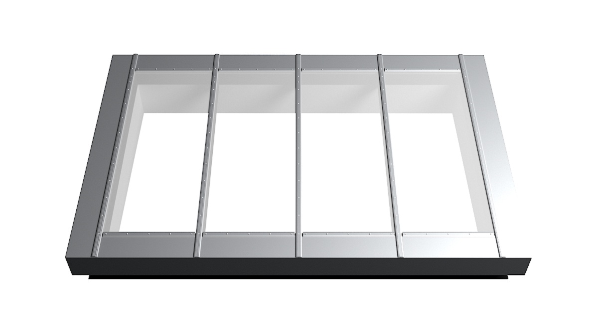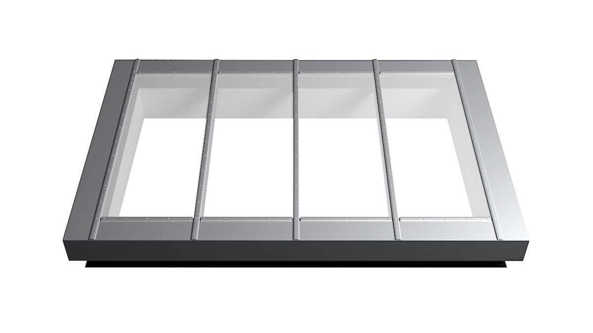 Nahaufnahme Glasdach Fire Resistance mit drei Feldern auf Flachdach mit Kiesumrandung.