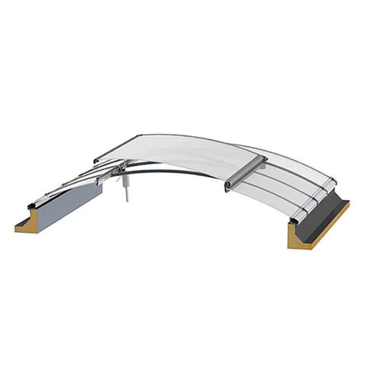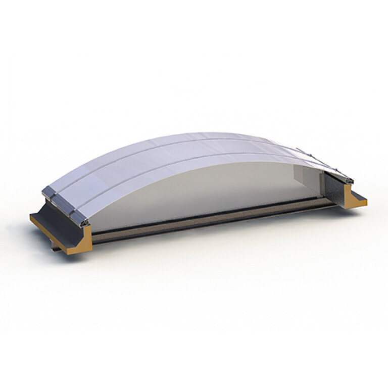 Rauchdicht und nicht brennbar (A1), besteht aus einem Aufbau mit 2 mm Alu / PC 10 / 2 mm Alu und dient der Unterteilung von Rauchabschnitten, indem das PC der Lichtbandverglasung ausschmilzt und die Abschottung den Bereich weiterhin begrenzt