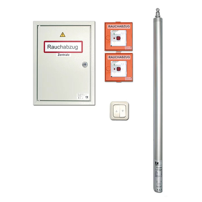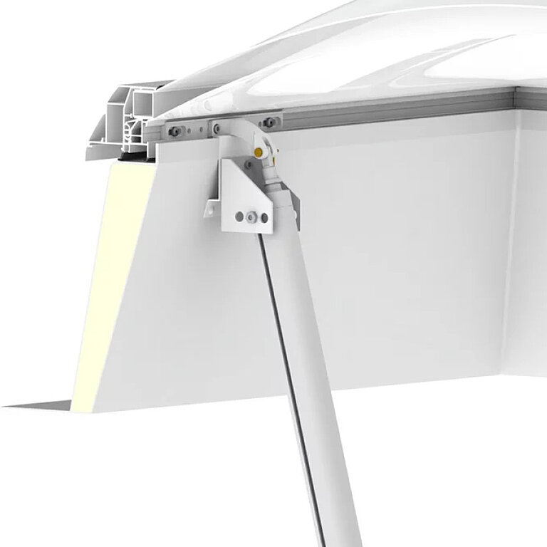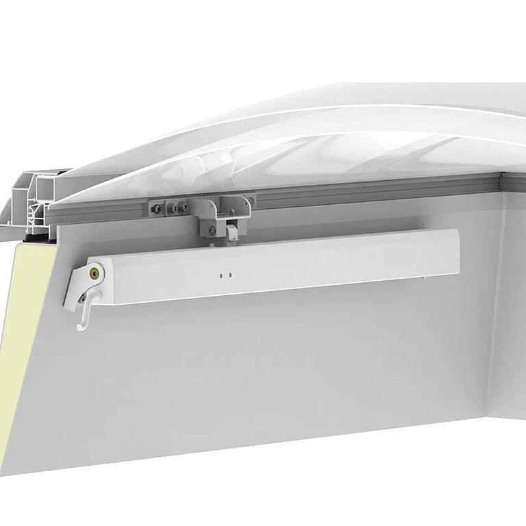 Geometrische Rauchableitung für lüftbare Lichtkuppeln mit RWA-Steuerzentrale, Notstromversorgung, zwei RWA-Tastern, einem Lüftertaster und Spindelmotor (24 V, 500 mm Hub)