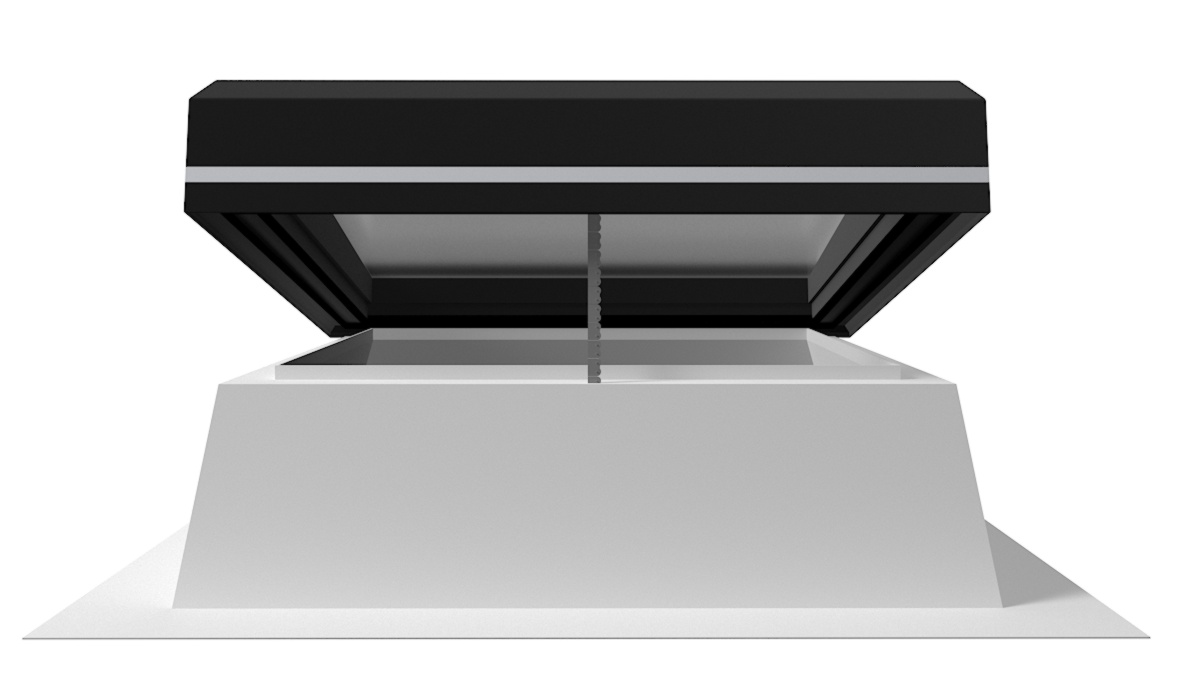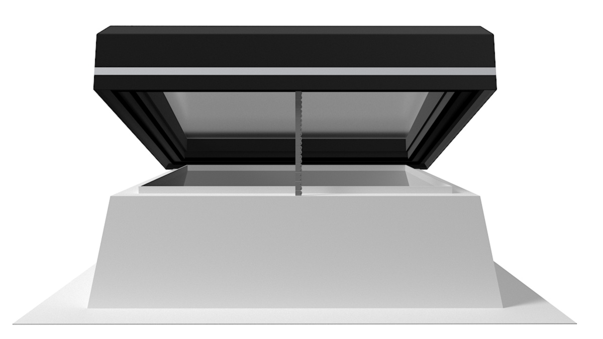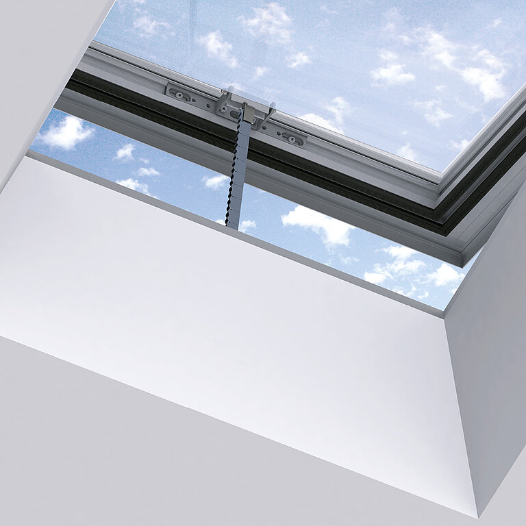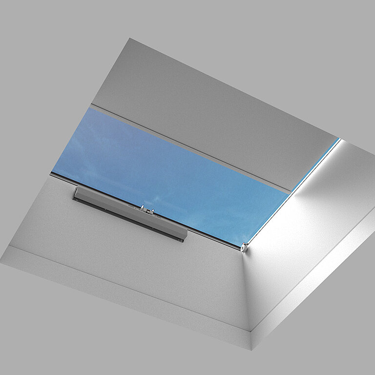 Optional für alle Größen als elektrisch betriebener, innenliegender Blendschutz, der an den Innenseiten des Aufsatzkranzes befestigt wird